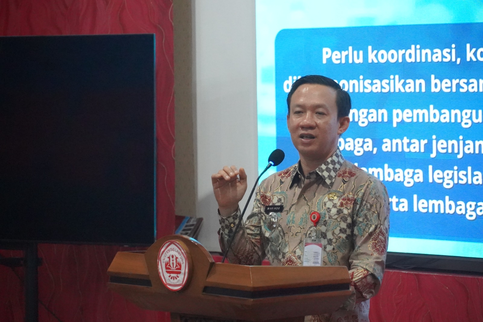 Dalam paparannya, Marindo menyampaikan kebanggaannya dapat kembali hadir di lingkungan Universitas Lampung, kampus yang dinilai telah banyak melahirkan tokoh dan pemimpin berpengaruh di Provinsi Lampung.